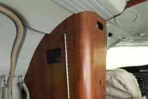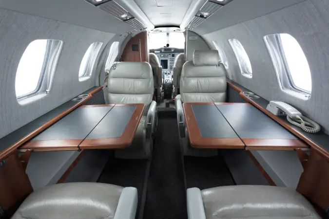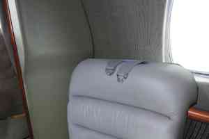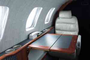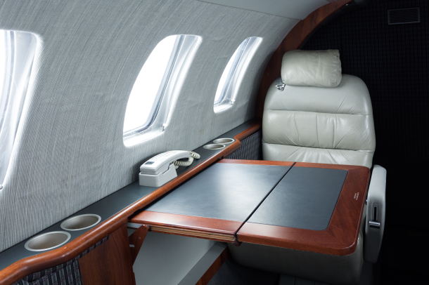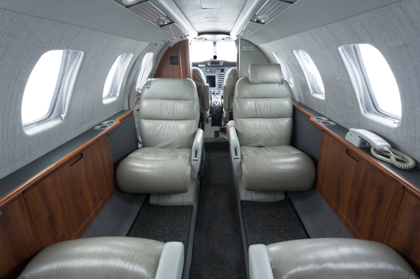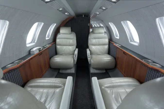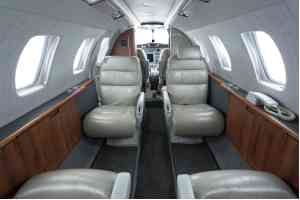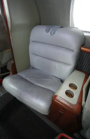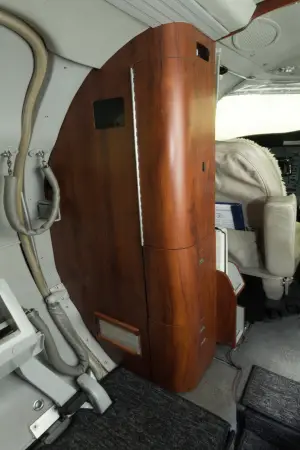 Six passenger configuration with seats finished in beige leather. LH Forward refreshment center with MAPCO.  LH & RH Executive Tables.  Aft RH Cabin Divider w/ curtain.  Aft Right Side belted Toilet seat. Original.