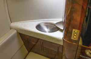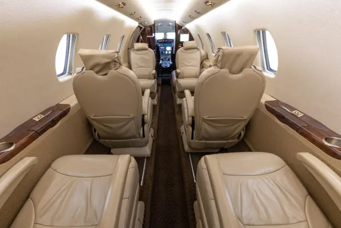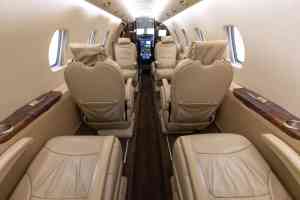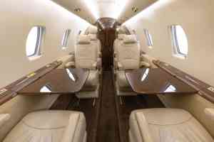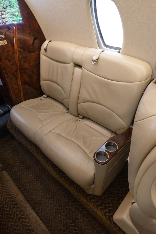 Six premium tan leather executive seats are complimented by a two-place side facing divan opposite entry door and belted seat opposite the lav. Burl cabinetry, tan headliner, tan sidewalls, neutral lower sidewalls and brown carpeting, extended galley with ample storage and ice cooler.