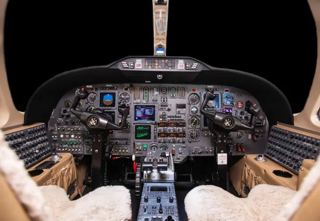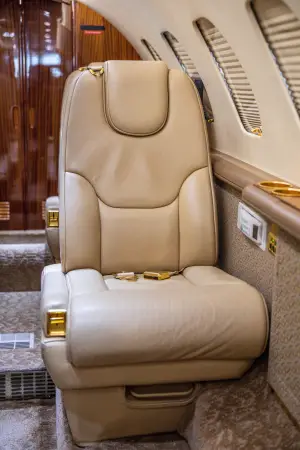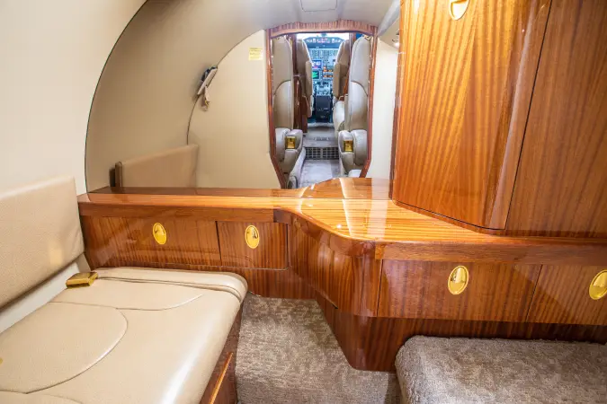 Complete interior refurbishment left no surface untouched. All cabin seats are covered in Mystic Safari leather from Garrett Leather, with pilot and copilot seats covered in Honey sheepskin. Cabinetry is veneered in Ribboned Sapele, and “Jackson Hole” 100% wool carpet installed throughout.