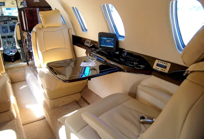 Beautiful tan and cream colored interior with 8-passenger double club seating, a right-hand forward refreshment center and left-hand forward closet. Four side wall monitors. One cabin monitor in forward cabinet/closet. Forward galley with custom storage in drawers, a microwave, a drop aisle storage box. Airshow 4000 system with dual DVD unit. Aircell Iridium cockpit and cabin. Cabinets, carpet and upper sidewalls completed by Cessna in 2013. Crew and cabin seats, lower sidewalls completed by Duncan Aviation, April 2018.