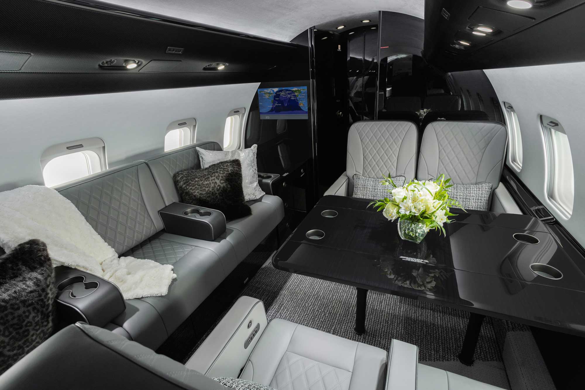 “The owner wanted his CL-604 to make a bold statement. His company’s logo is gray and black; he wanted those colors featured in the paint scheme, which is black on the belly and tail with a splash of gray across the sides. We also carried those colors throughout the interior,” says Pridemore. “There are so many unique details we incorporated throughout the interior, and the logo added an additional, personal touch.”