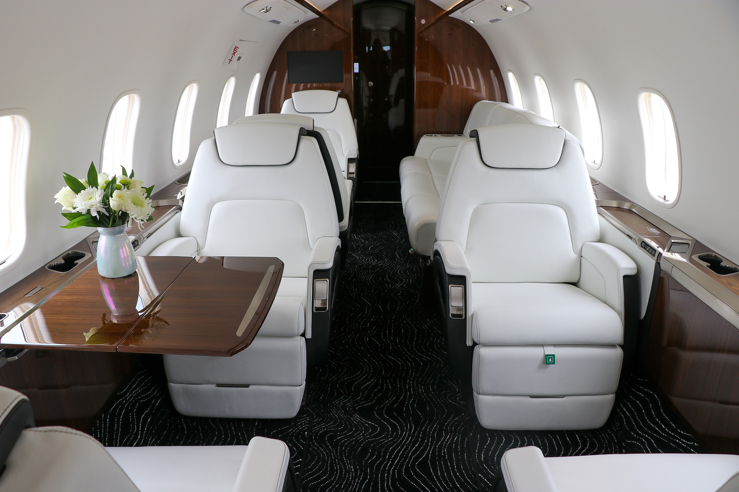 “The client wanted a cabin that felt current and refined,” Pfeiffer said. “The two-tone seating, custom stitching, and unique carpet design achieved exactly that—creating an interior that is visually striking while maintaining a clean, cohesive look.”