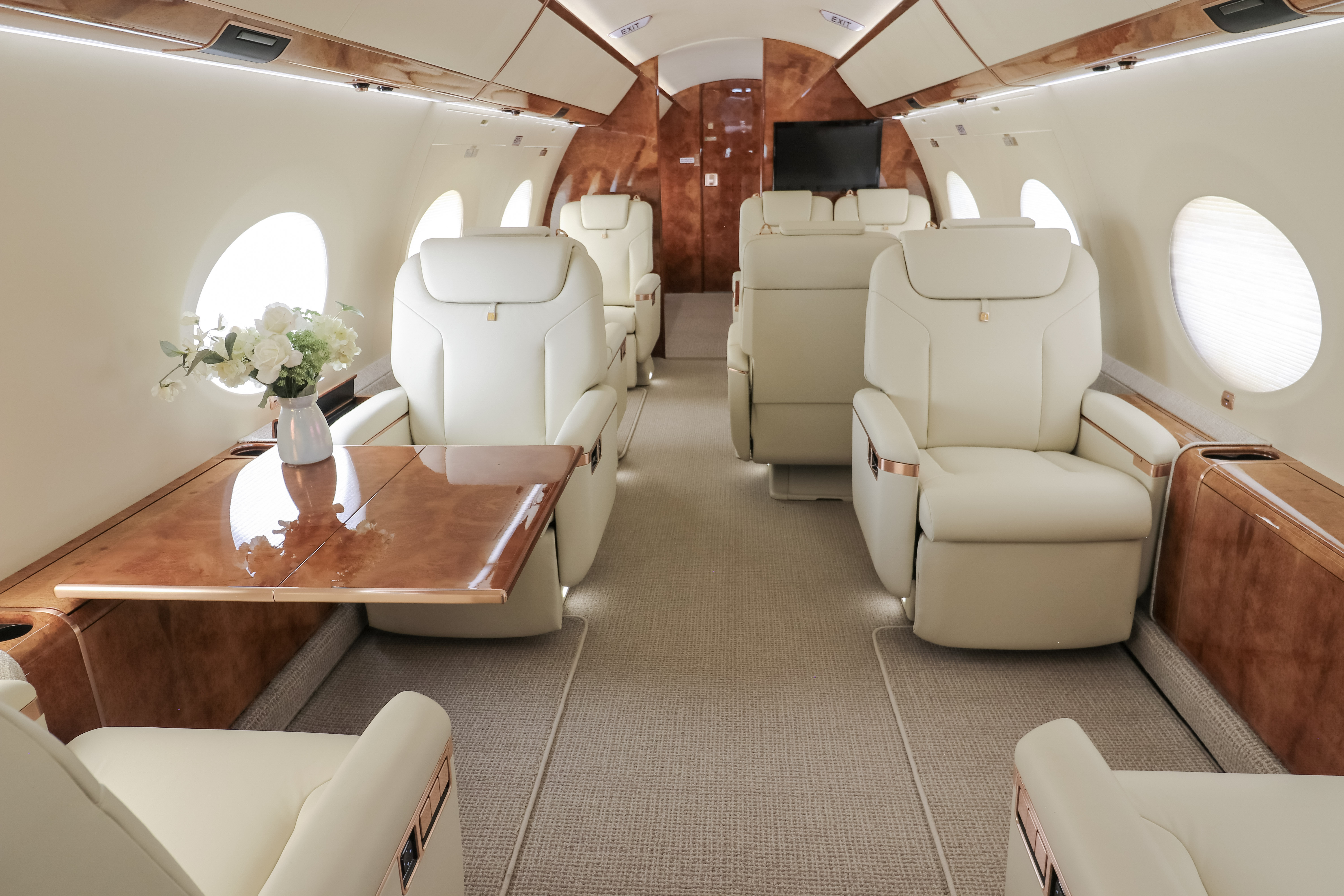 To complement the warmth of the wood, the design focused on a transitional style that seamlessly blends traditional and modern elements, creating a serene environment ideal for long flights. The seats were reimagined with lighter neutral leather and delicate detailing, giving them a fresh, contemporary presence. Contrasting pulls and rose-gold replated accents add refinement and tie in with the existing hardware. The divan was upholstered in a rich, heathered wool to create a grounding focal point at the rear of the cabin. The lower sidewalls were finished in a textured fabric that blends seamlessly with the carpet and adds depth to the overall design.