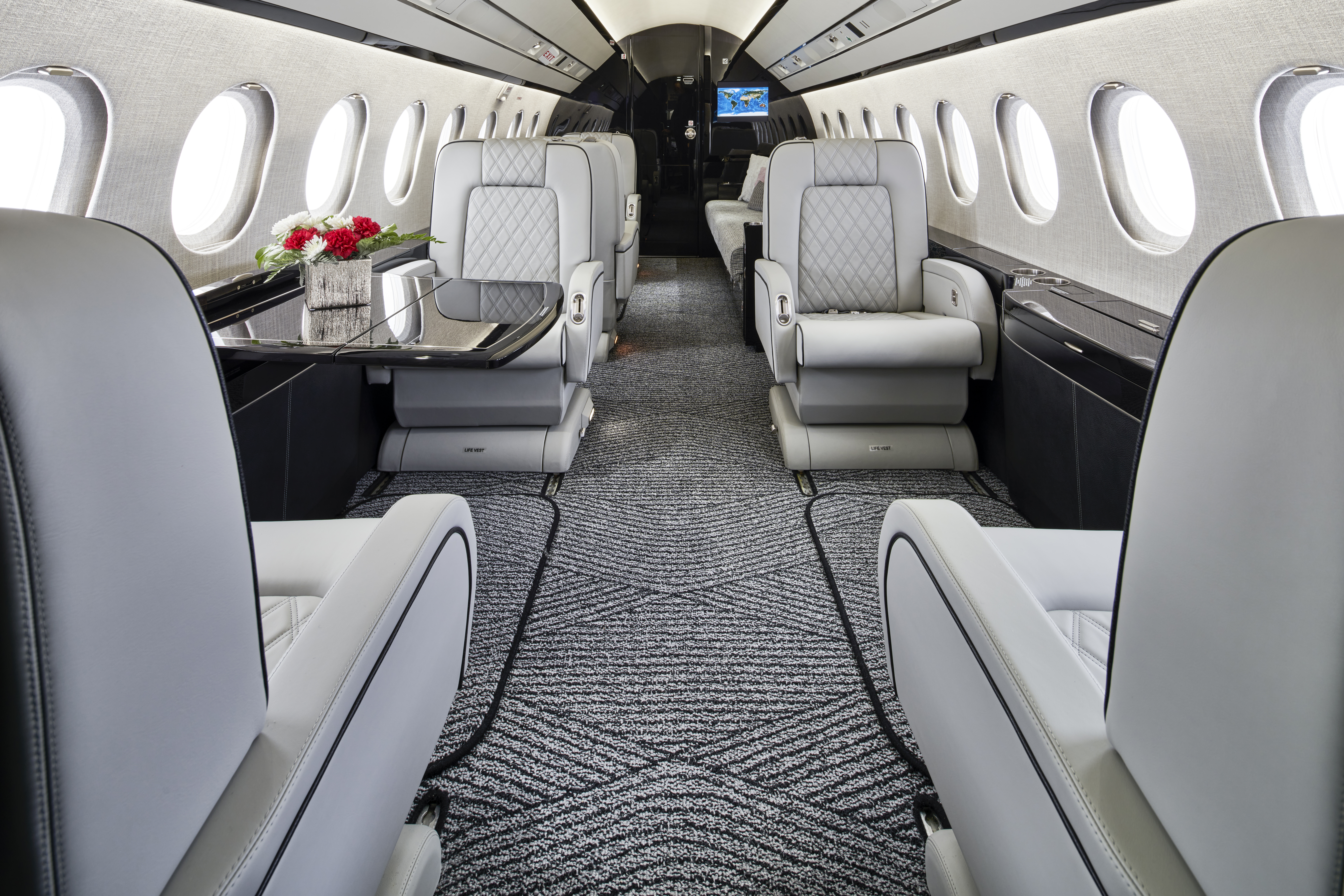 “The owner really likes the heavy contrast of greys and blacks,” said Pridemore. “We gave the interior a very textural and masculine look that modernized the aircraft.”
